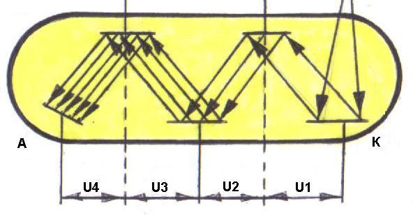 Фотоэлемент, основанный на явлении фотоэффекта, не позволяет измерять слабые световые потоки, так как фототок получается ничтожно малым. Поэтому широко используются фотоэлектронные умножители (ФЭУ), позволяющие без всякой дополнительной аппаратуры усиливать слабые фототоки в огромное число раз ( до десятков миллионов). Внутреннее усилие фототока в ФЭУ основано на явлении вторичной электронной эмиссии. Бомбардировка поверхности металла, полупроводника или диэлектрика электронным пучком, ускоренным полем, вызывает эмиссию вторичных электронов с облучаемой поверхности. Эмиссионные свойства поверхности характеризуются коэффициентом вторичной эмиссии - отношением числа выбитых электронов n2 к числу падающих первичных электронов n1 , т.е. s = n2/n1. Схематическое устройство многокаскадного фотоумножителя и принцип его действия приведены на рисунке. |