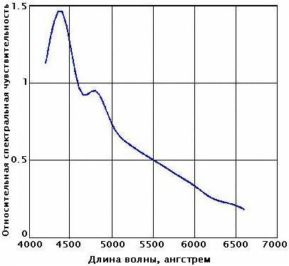 Фотоумножитель состоит из светочувствительного катода и ряда вторичных эмиттеров (динодов), расположенных так, чтобы наибольшее число фотоэлектронов, испускаемых эмиттером, достигало следующего эмиттера. Эмиттеры изготавливаются из материала с большим коэффициентом вторичной эмиссии, а их форма и расположение задаются выбранным способом фокусировки и ускорения электронов. И то и другое обычно выполняется с помощью электростатического поля. Оно создается в результате приложения к каждому эмиттеру последовательно возрастающего положительного потенциала.   Вторично-эмиссионная умножительная система фотоэлектрических приборов характеризуется коэффициентом усиления k. Коэффициент одного каскада ФЭУ определяется коэффициентом вторичной эмиссии s и тем, какая часть эмитированных электронов a достигает следующего эмиттера. Для современных ФЭУ a = 0,7 - 0,9. Коэффициент усиления на один каскад составляет as. Если ФЭУ содержит n эмиттеров и коэффициент усиления для всех одинаков, то общее усиление (коэффициент усиления) k = ( a s ) n. Оптимальное значение не превышает 107 - 108.   Величина фототока зависит не только от интенсивности, но и от длины волны падающего на фотокатод светового потока. Поэтому для характеристики фотокатода фотоэлектронных приборов вводится понятие спектральной чувствительности. Sl - отношение величины фототока dI, возникающего в цепи фотокатода при падении светового потока dFl в единичном интервале длин волн dl , к мощности монохроматического излучения с длиной волны l : Sl=dI/dFl . На практике обычно используют безразмерную величину S0l=Sl/Slmax, называемую относительной спектральной чувствительностью фотокатода. Здесь Slmax - максимальное значение спектральной чувствительности фотокатода в интересующем нас спектральном диапазоне, соответствующее длине волны lmax. График зависимости относительной спектральной чувствительности фотокатода ФЭУ-100, используемого в данной работе, от длины волны излучения представлен ниже. |