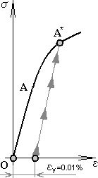 называется напряжение, при котором остаточная (пластическая) деформация составляет 0.01%. Для нахождения на диаграмме растяжения материала точки А*, соответствующей условному пределу упругости, необходимо воспользоваться законом разгружения и повторного нагружения.